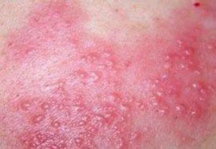 皮疹沿肋间神经、三叉神经或腰骶神经走向分布,严格不超过身体中线,初期是红斑,很快变成群集水疱,疱液清亮;