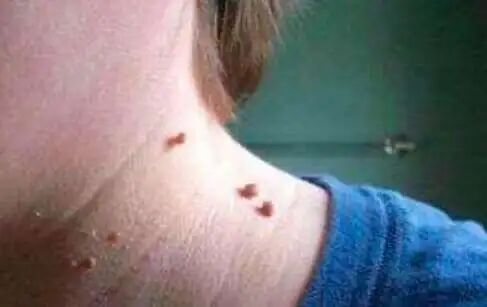 挤压时会排出白色奶酪样物质(软疣小体),常见于面部、躯干、四肢和外生殖器,一般不痛不痒,但搔抓后会自身接种,长成一串。