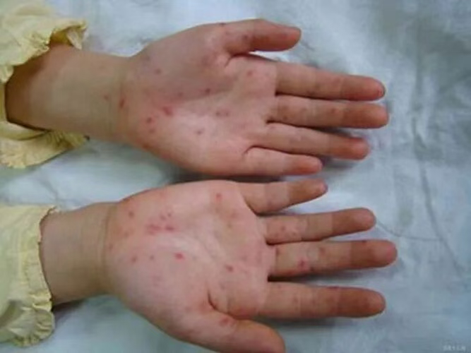 典型表现:起病急,先有低热、咽痛、头痛,1 天内就会出疹—— 淡红色斑丘疹,从面颈部开始,迅速蔓延到躯干和四肢,手掌、足底通常不长疹。